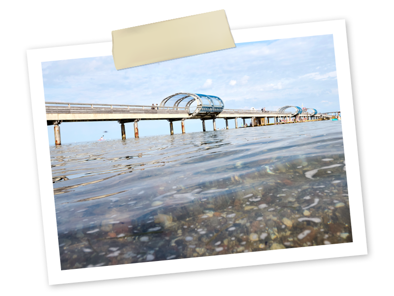 Schon von Weitem ist zu sehen, dass die Kellenhusener Seebrücke etwas Besonderes ist. Die halbovalen, nachts sogar beleuchteten Streben geben der Brücke mit ihren Hängematten, Badestegen und der Aussichtsplattform ein unverwechselbares Flair. Wir lassen den Blick über das Meer schweifen und füllen unsere Lungen mit der guten Seeluft, bevor wir die Heimreise antreten. Später im Zug schauen wir zufrieden aus dem Fenster und lassen einen herrlichen Tag Revue passieren, während wir unser leckeres Smørrebrød vom Bäckerburschen mümmeln.
