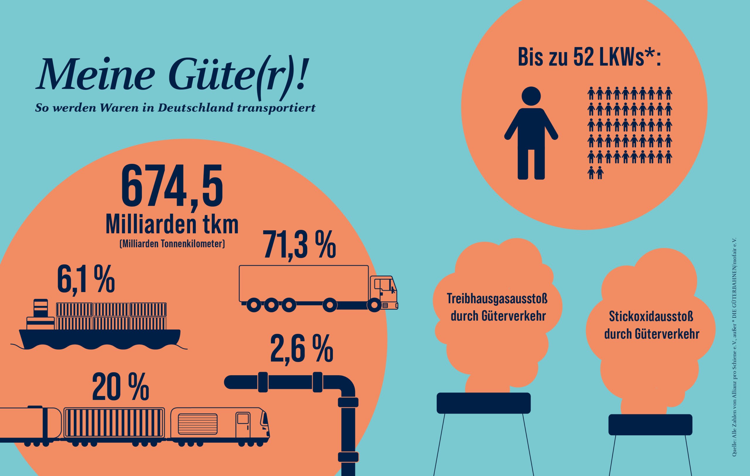 LKW: 119 g/tkm Binnenschiff: 34 g/tkm Güterzug: 15 g/tkm LKWs stoßen im Vergleich zu Güterzügen das 8-Fache an Treibhausgasen aus, die maßgeblich zur Erderwärmung beitragen.